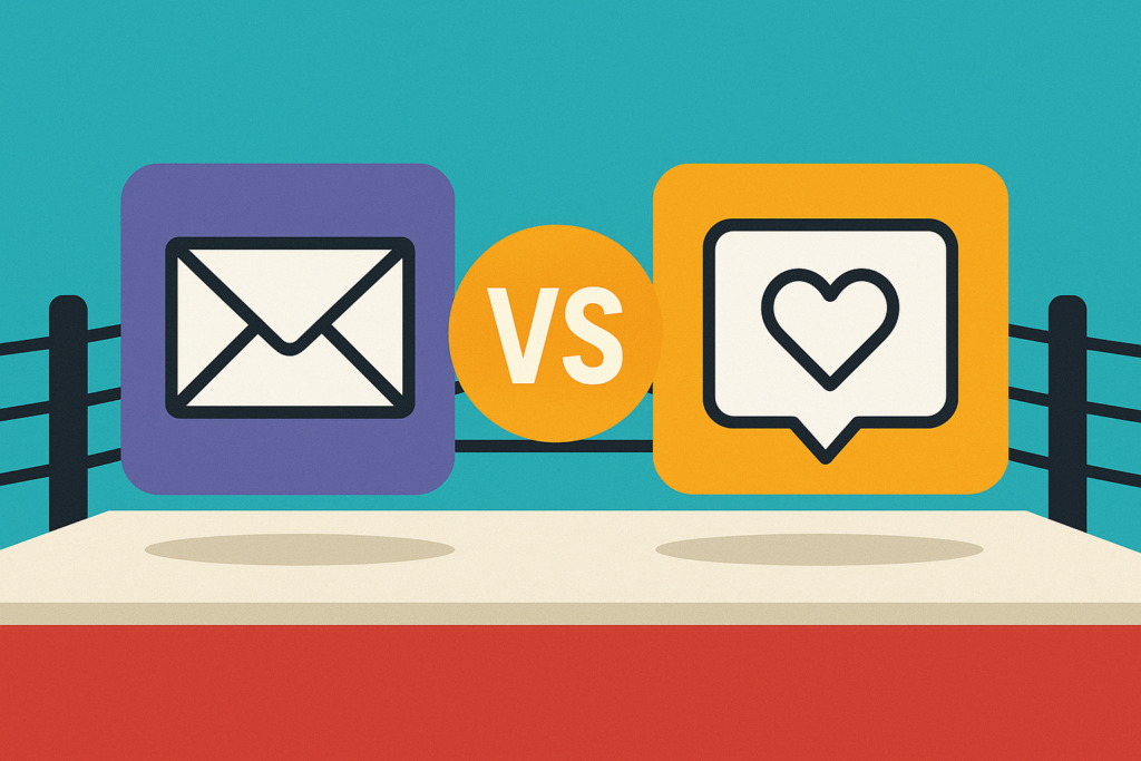 Ladies and gentlemen, welcome to tonight’s main event! Introducing, in the red corner, with decades of experience and muscles to match, the original internet marketing powerhouse… EMAIL MARKETING! And, in the blue corner, really needing no introduction, the most impressive contender of the past fifteen…